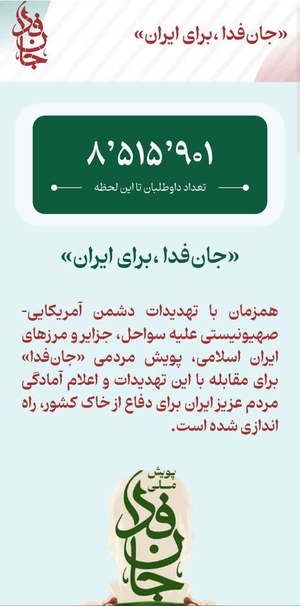 به گزارش خبرگزاری فارس از اهواز، همزمان با افزایش تهدیدات دشمنان آمریکایی-صهیونیستی علیه سواحل، جزایر و مرزهای ایران اسلامی، نماینده ولی‌فقیه در استان خوزستان با پیوستن به پویش مردمی «جانفدا»، از عموم مردم و دوستداران ایران خواست تا به این حرکت ملی بپیوندند. این پویش با هدف اعلام آمادگی مردمی برای دفاع از تمامیت ارضی کشور راه‌اندازی شده و تاکنون با استقبال گسترده مواجه شده است؛ به‌گونه‌ای که شمار مشارکت‌کنندگان آن از مرز ۸ میلیون نفر عبور کرده است.نماینده ولی‌فقیه در خوزستان در نمازجمعه اهواز، ضمن تأکید بر ضرورت انسجام و حضور آگاهانه مردم در صحنه، مشارکت در این پویش را نمادی از همبستگی ملی و آمادگی برای صیانت از ایران اسلامی دانست.علاقه‌مندان می‌توانند با ارسال عدد ۱ به سرشماره ۳۰۰۰۱۱۵۵ یا مراجعه به پایگاه اینترنتی janfadaa.ir نسبت به ثبت‌نام در این پویش اقدام کنند.