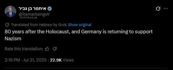 بن گویر، وزیر امنیت ملی اسرائیل، درباره ادعای به رسمیت شناختن کشور فلسطین توسط دولت آلمان، گفت که «۸۰ سال پس از هولوکاست، آلمان دوباره به حمایت از نازیسم بازمیگردد».در پاسخ به این فرد نادان و جنایتکار باید گفت: اگر در یک طنز تلخ تاریخ، فلسطین و غزه مظلوم را، "هیتلر" و اسرائیل خونخوار "را یهودیان آشویتس" تصور کنیم. پس بی شک، کار هیتلر قابل دفاع بوده است. او می دانست که فرزندان آشویتس در آینده چگونه با جعل و تحریف حقیقت، جای جنایتکار و قربانی را عوض خواهند کرد. השר לביטחון לאומי של ישראל, בן גויר, אמר כי "80 שנה לאחר השואה, גרמניה שוב תומכת בנאציזם".בתגובה לאדם בור ופושע זה, עלינו לומר:70 שנות פשע בתירוץ של סיפור מוגזם.אם אנו מדמיינים את פלסטין ועזה המדוכאות כ"היטלר",ואת ישראל צמאת הדם כ"יהודי אושוויץ".לכן, פעולתו של היטלר הייתה בהחלט ראויה להגנה. הוא ידע כיצד ילדי אושוויץ יעוותו את האמת בעתיד.