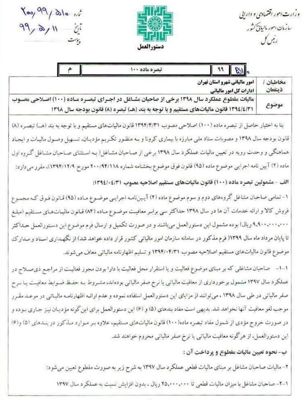 ۰۰۰ ریال، با ۸ ( هشت درصد) افزایش نسبت به عملکرد سال ۱۳۹۷ ۲-۴- صاحبان مشاغل مالیاتی با میزان مالیات قطعی بیشتر از ۱۰۰,۰۰۰,۰۰۰ ریال با ۱۲٪ (دوازده درصد) افزایش نسبت به عملکرد سال ۱۳۹۷ تذکر: بندهای فوق مربوط به مؤدیانی می باشد که مجموع فروش کالا و ارائه خدمات آنها در سال ۱۳۹۸ از مبلغ ۹,۹۰۰,۰۰۰,۰۰۰ ریال بیشتر نباشد مودیانی که میزان فروش کالا و ارائه خدمات آنها در سال ۱۳۹۸ بیش از مبلغ مذکور می باشد. مکلف به تسلیم اظهارنامه و پرداخت مالیات متعلق با رعایت مقررات مربوط می باشند. 3- صاحبان مشاغلی که تمایل به استفاده از شرایط این دستورالعمل را دارند، می بایست از طریق سیستم الکترونیکی (طبق فرم مربوط) از طریق پایگاه اینترنتی http://tax.gov.ir مراتب را به سازمان امور مالیاتی کشور اعلام نمایند. ۴- در خصوص صاحبان مشاغلی که امکان پرداخت مالیات مقطوع موضوع این دستورالعمل را به صورت یک جا تا پایان مرداد ماه سال ۱۳۹۹ نداشته باشند، مالیات مقطوع فوق حداکثر تا پنج ماه به صورت مساوی تقسیط می شود. عدم پرداخت به موقع مالیات و یا در صورت تقسیط، عدم پرداخت اقساط در سررسیدهای مقرر مشمول جریمه موضوع ماده (۱۹۰) قانون مالیاتهای مستقیم خواهد بود. ۵- هرگاه اسناد و مدارک مثبته ای به دست آید که مشخص شود مجموع فروش کالا و ارائه خدمات مؤدی در سال ۱۳۹۸ بیش از مبلغ ابرازی به عنوان فروش کالا و خدمات و سایر درآمدهای فرم موضوع بند (۳) این دستور العمل بوده، مشروط به این که مجموع در آمد مؤدی از حدنصاب مقرر۹٫۹۰۰٫۰۰۰٫۰۰۰ ریال، تجاوز ننماید، با رعایت مقررات بند(۴۰۱) ماده (۴۱) آیین نامه اجرایی موضوع ماده (۲۱۹) قانون مالیاتهای مستقیم نسبت به محاسبه و مطالبه مابه التفاوت مالیات متعلقه با رعایت مقررات اقدام خواهد شد ۶- هرگاه اسناد و مدارک مثبتهای به دست آید که مشخص شود مجموع فروش کالا و ارائه خدمات مؤدی در سال ۱۳۹۸ بیش از مبلغ ۹٫۹۰۰٫۰۰۰٫۰۰۰ ریال بوده، مؤدی مذکور مشمول مفاد تبصره ماده (۱۰۰) قانون مالیاتهای مستقیم نبوده و علاوه بر محاسبه و مطالبه مالیات وفق مقررات ماده (۹۷) قانون مالیاتهای مستقیم، مشمول جرائم متعلقه به ویژه جریمه عدم تسلیم اظهارنامه مالیاتی در موعد مقرر قانونی و همچنین عدم امکان استفاده از معافیت های قانونی از جمله معافیت موضوع ماده (۱۰۱) قانون مالیات های مستقیم خواهد شد. ج- سایر موارد: ۸- صاحبان مشاغل صدرالذکر که سال ۱۳۹۸ اولین سال فعالیت آنها بوده است، مشمول برخورداری از مفاد این دستورالعمل نخواهند بود و لذا مکلف به انجام تکالیف قانونی مقرر (از جمله تسلیم اظهارنامه مالیاتی در موعد مقرر) می باشند.