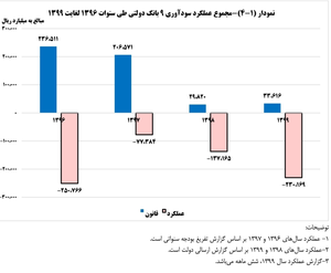 همچنین در «خلاصه مدیریتی» این گزارش دیوان محاسبات با اشاره به زیان ده بودن مجموع عملکرد بانکهای دولتی در سال های ۹۶ تا ۹۸ آمده است: بررسی عملکرد بانکهای دولتی در سال ۹۹ نشان میدهد علیرغم پیش بینی سود، مجموع عملکرد نه بانک دولتی در شش ماهه نخست سال به میزان منفی ۲۳۰ هزار و ۳۶۹ میلیارد ریال و با حذف عملکرد بانک مرکزی به میزان منفی ۲۲۳ هزار و و ۹۰۷ میلیارد ریال زیان ده شده اند نکته جالب توجه آنکه عملکرد بانک مرکزی در شش ماهه نخست امسال به میزان ۶۲۶۱ میلیارد ریال زیان ده بوده است. البته بانک مرکزی یک نهاد سیاستگذار در حوزه پولی و بانکی بوده و یک بانک تجاری اقتصادی محسوب نمیشود و درآمد سالانه آن از محل جریمه های دریافتی به دلیل اضافه برداشت بانکها از بانک مرکزی و تسعیر ارز حاصل می شود. به گزارش فارس با وجود زیانهای انباشته چند ۱۰ هزار میلیاردی همچنان حقوقهای نامتعارف و پاداشهای گزاف صرفا بر اساس شناسایی سودهای موهوم به تعدادی از کارکنان و مدیران پرداخت میشود. انتهای پیام/.