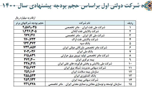 براساس اطلاعات جدول فوق، مجموع پرسنل نه بانک دولتی، 111 هزار و 758 نفر هستند و این افراد به صورت متوسط (میانگین وزنی) در سال آینده، 16 میلیون و 800 هزار تومان در ماه دریافتی دارند *سه بانک دولتی در بین ۱۵ شرکت بزرگ دولتی از لحاظ حجم بودجه سازمان برنامه و بودجه گزارش داد: بانک سپه بر اساس حجم بودجه پیشنهادی سال ۱۴۰۰ به عنوان پنجمین شرکت دولتی محسوب می شود که حجم بودجه آن بالغ بر ۹۳ هزار و ۴۳۰ میلیارد تومان است. بانک ملی نیز در جایگاه هفتم قرار گرفته که حجم بودجه آن ۷۰ هزار و ۳۰۳ میلیارد تومان پیش بینی میشود. بانک کشاورزی هم جایگاه سیزدهم این جدول با ۲۵ هزار و ۵۵۲ میلیارد تومان به خود اختصاص داد. *چند بانک دولتی در دو سال اخیر زیانده بوده اند؟ براساس بررسی های دیوان محاسبات، علیرغم سودده بودن تعداد 5 بانک دولتی و سربهسر بودن تعداد 3 بانک و زیان ده بودن 1 بانک در بودجه پیشنهادی سال 1400 ، عملکرد سال 1398 و شش ماهه اول سال 1399 بانکها طبق گزارش ارائه شده حاکی از زیانده بودن به ترتیب تعداد 3 و 6 بانک در سالهای مذکور در این بخش میباشد.
