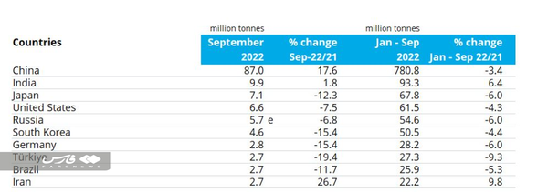 ۷ میلیون تنی ایران در ماه سپتامبر، ۷۱ درصد تولید فولاد غرب آسیا در اختیار ایران بوده است * بیشترین کاهش تولید برای ترکیه بر اساس این گزارش، چین با تولید ۸۷ میلیون تن، هند با تولید ۹.۹ میلیون تن و ژاپن با تولید ۷.۱ میلیون تن، سه کشور نخست تولید فولاد در جهان هستند. تولید فولاد ترکیه با کاهش ۱۹.۴ درصدی بیشترین میزان افت را به خود اختصاص داده است. تولید فولاد ژاپن ۱۲.۳ درصد، آمریکا ۷.۵ درصد، روسیه ۶.۸ درصد، کره جنوبی ۱۵.۴ درصد، آلمان ۱۵.۴ درصد و برزیل ۱۱.۷ درصد کاهش یافته است. بر اساس آمارهای انجمن جهانی فولاد، تولید فولاد چین 17.6 درصد و تولید فولاد هند 1.8 درصد افزایش یافته است. * افزایش 3.7 درصدی تولید فولاد در جهان بر اساس این گزارش، تولید فولاد جهان در ماه سپتامبر ۲۰۲۲ نسبت به مدت مشابه سال گذشته ۳.۷ درصد افزایش یافته و به ۱۵۱.۷ میلیون تن رسیده است. همچنین تولید فولاد جهان در ۹ ماه نخست امسال نسبت به مدت مشابه سال گذشته ۴.۳ درصد افت کرده و به ۱۴۰۵.۲ میلیون تن رسیده است. * کاهش تولید ۱۷ درصدی تولید فولاد در اروپا تولید فولاد در ۲۷ کشور عضو اتحادیه اروپا در ماه سپتامبر با کاهش ۱۶.۷ درصدی نسبت به مدت مشابه سال گذشته به ۱۰.۷ میلیون تن رسیده است. سایر کشورهای اروپایی یعنی بوسنی و هرزگوین، مقدونیه، نروژ، صربستان، ترکیه و انگلیس نیز کاهش ۱۸.۶ درصدی تولید داشتند و میزان تولید فولاد آنها به ۳.۴ میلیون تن رسیده است.