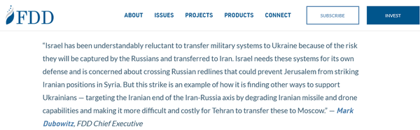لذا، رژیم صهیونیستی بر آن شد تا با استفاده از عوامل فارسی زبان دست به این اقدام مضحک در اصفهان بزند تا مقداری به سمپاتهای خود مُسَکِّن روحی بدهد «مارک دوبوویتز» سوپر صهیونیست رادیکال، مدیر عامل اجرایی اندیشکده موسوم به بنیاد دفاع از دمکراسی (FDD) آمریکا و فعال در آشوبهای مهر و آبان ۱۴۰۱، در رابطه با این حمله نوشت: «اسرائیل تمایلی به انتقال سامانههای نظامی به اوکراین ندارد، زیرا این خطر وجود دارد که سامانهها به دست روسها بیافتند و [سپس] به ایران منتقل شوند. اسرائیل برای دفاع از خود به این سامانهها نیاز دارد و نگران عبور از خط قرمز روسیه است.» «مارک دوبوویتز» در ادامه نوشت: «اما این حمله [منظور اصفهان] نمونهای است از اینکه چگونه مسیرهای دیگری برای برای حمایت از اوکراینیها پیدا کنیم.» مدیر عامل اجرایی اندیشکده تروریستی FDD این راهکار را اینگونه بیان میکند: «هدف قرار دادن محور ایران - روسیه از طریق تخریب توانمندیهای پهپادی و موشکی ایرانیها و نیز ایجاد هزینه برای تهران مبنی بر انتقال این [ادوات نظامی] به مسکو.» [1]: https://www.arabnews.com/node/2236201 [2]:https://www.hudson.org/defense-strategy/time-recalibrate-america-middle-east-policy [3]:https://www.fdd.org/analysis/2023/01/31/israel-strikes-iranian-military-facility/ پایان پیام/. 12:46 - 16 بهمن 1401
