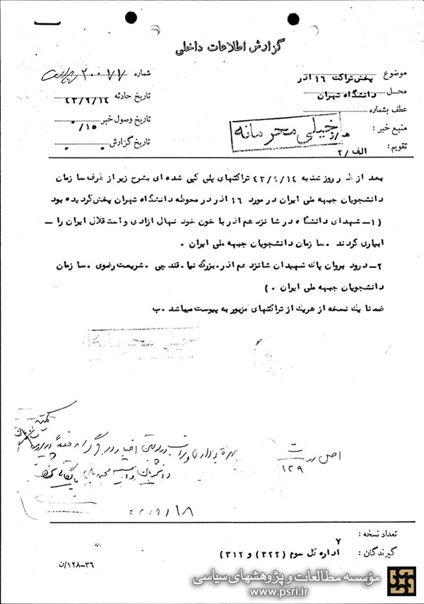 در این سند سابقاً سری آمده است: به مناسبت روز ۱۶ آذر(سالروز بقتل رسیدن سه تن از دانشجویان دانشکده فنی دانشگاه تهران در سال ۱۳۳۲) از اواخر آبان ماه گذشته برخی از دانشجویان دانشگاه تهران و دانشکده پلی تکنیک، ضمن نوشتن شعارهائی از جمله «۱۶ آذر روز دانشجو میباشد» روی قسمتی از دیوارهای دانشکدههای دانشگاه مذکور و دانشکده صنعتی پلی تکنیک تهران، از روز ۱۲/۹/۴۸ اعلامیهها و تراکتهائی با مضامین زیر تهیه و در دانشگاه تهران و برخی از مراکز عالی آموزشی پایتخت به تعداد محدود پخش نمودند: «.. متحد شوید. آمریکا و سگهای زنجیری آنها را درهم شکنید، خاطره شهیدان ۱۶ آذر گرامی باد» در این اعلامیهها و تراکتها ضمن یادآوری خاطره روز مذکور و ادعای اینکه حکومت محمد مصدق در یک توطئه مشترک امپریالیسم جهانی و ارتجاع داخلی سرنگون گردید و دولت امپریالیست امریکا در دستگاههای اداری کشور ایران نفوذ دارد، درباره چگونگی ادامه فعالیتها و مبارزات دانشجویان در سطح دانشگاهها، واقعه ۱۶ آذر سال ۱۳۳۲ و کشته شدن ۳ نفر از دانشجویان دانشکده فنی دانشگاه تهران مطالبی درج و در خاتمه با ذکر اینکه دانشگاه همچنان پایگاهی برای آزادیخواهان و میهنپرستان پابرجا خواهد ماند، از دانشجویان خواسته شده که در روز ۱۶/۹/۴۸ از حضور در کلاسهای درس خودداری نمایند.