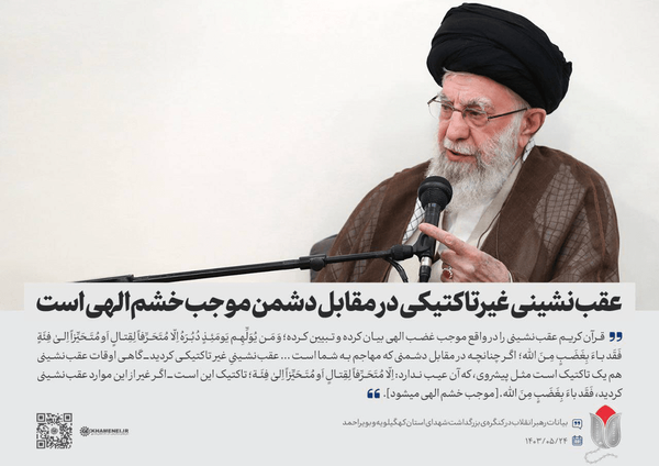 اگر چنانچه در مقابل دشمنی که مهاجم به شما است، عقب‌نشینیِ غیر تاکتیکی کردید ــ گاهی اوقات عقب‌نشینی هم یک تاکتیک است مثل پیشروی، که آن عیب ندارد: اگر غیر از این موارد عقب‌نشینی کردید،[موجب خشم الهی میشود]/ ۱۴۰۳/۵/۲۴
