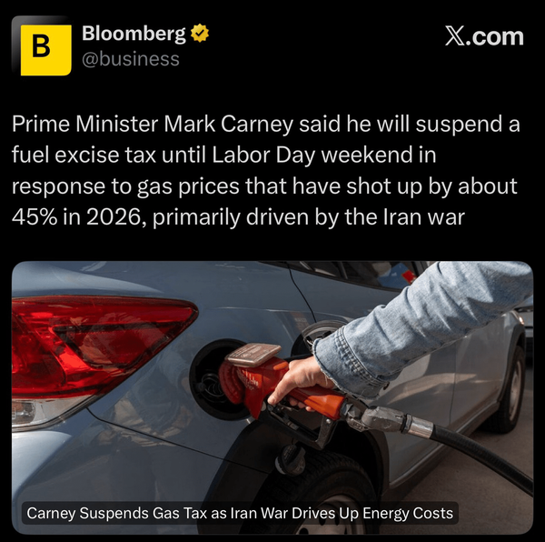 نخستوزیر کانادا، مارک کارنی اعلام کرد در واکنش به افزایش شدید قیمت بنزین، مالیات مصرف سوخت را بهطور موقت تا تعطیلات «روز کارگر» تعلیق میکند.