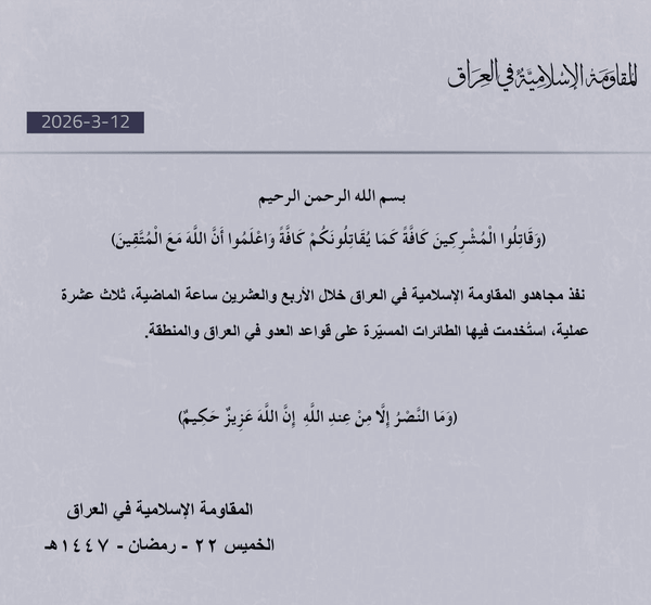 مقاومت اسلامی عراق بامداد پنجشنبه اعلام کرد که طی بیستوچهار ساعت گذشته، ۱۳ عملیات پهپادی علیه مواضع اشغالگران آمریکایی انجام داده است.