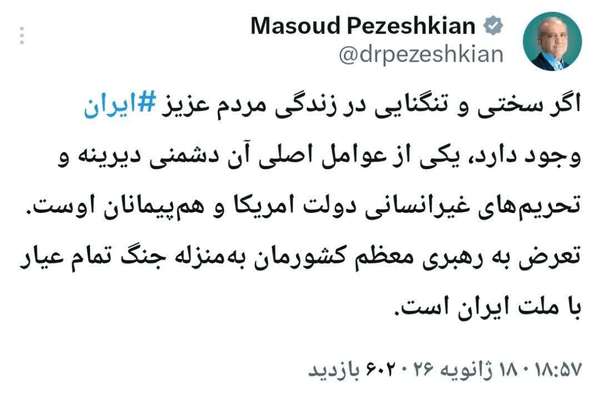 @Lobnan28 دی 1404رئیس جمهور در توئیت خودشون بیان کردن: تعرض به رهبری (مدظله العالی) به منزله جنگ تمام عیار است +خدمت اقای پزشکیان عرض کنم که هیچ کدام از دشمنان ما نمیتوانند حتی گوشه چشمی چپ نگاه کنند به رهبری چه برسه به اینکه بتوانند خدایی نکرده به رهبرمان آسیب بزنن چون اصن در حد این حرفا نیستند و نخواهند بود