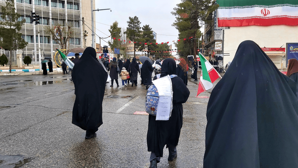 نازنین هم کلاس دومی است، میگوید: بهخاطر دخترهای مدرسه میناب با لباس فرم و کولهپشتی به راهپیمایی آمدهام.