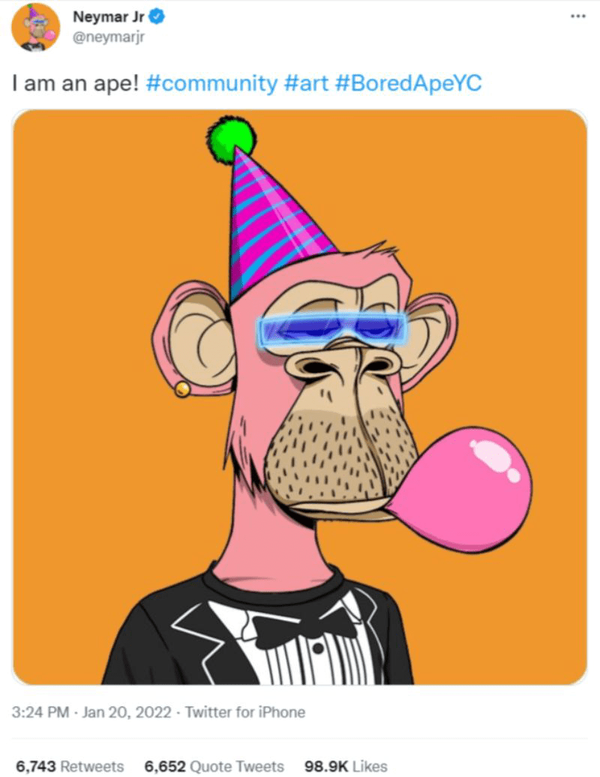 این فوتبالیست، نخستین بار در ژانویه سال جاری وارد دنیای NFTها شد. در آن زمان، او با پرداخت یک میلیون دلار، صاحب دو توکن NFT از مجموعه مشهور باشگاه میمونهای کسل (BAYC) شد اما توکنهای نیمار در حال حاضر کمتر از ۳۵۰ هزار دلار ارزشگذاری میشوند.