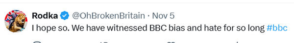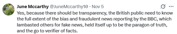 بله (باید از آن شکایت شود)، چون باید شفافیت وجود داشته باشد. مردم بریتانیا باید کاملاً بدانند میزان جانبداری و گزارش‌های خبری گمراه‌کنندهٔ بی بی سی، رسانه‌ای که دیگران را به انتشار اخبار جعلی متهم می‌کرد، خودش را الگوی حقیقت نشان می‌داد و مرجعِ راستی‌آزماییِ خبر معرفی می‌کرد،‌تا چه حد است.