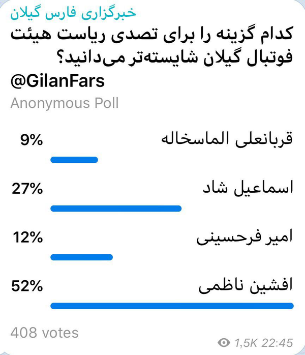 با پایان مهلت نظرسنجی تلگرامی خبرگزاری فارس گیلان، مدیرعامل باشگاه سپیدرود رشت در صدر نظرسنجی افکار عمومی برای انتخابات هیئت فوتبال گیلان قرار گرفت.