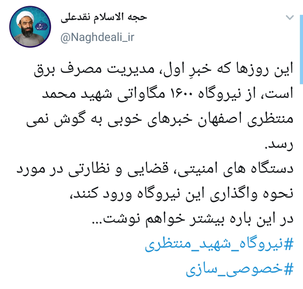به گزارش خبرگزاری فارس از اصفهان، روز گذشته حجت‌الاسلام محمدتقی نقدعلی، نماینده مردم خمینی‌شهر در مجلس شورای اسلامی با انتشار توئیتی از وجود مشکلاتی در نحوه واگذاری نیروگاه شهید محمد منتظری واقع در شمال اصفهان سخن به میان آورده و خواستار ورود دستگاه‌های مسؤول به این پرونده شد. وی در صفحه توئیتری خود این‌گونه نوشت: ‏این روزها که خبر اول، مدیریت مصرف برق است، از نیروگاه ۱۶۰۰ مگاواتی شهید محمد منتظری اصفهان خبرهای خوبی به گوش نمی‌رسد؛ دستگاه‌های امنیتی، قضایی و نظارتی در مورد نحوه واگذاری این نیروگاه ورود کنند، در این‌باره بیشتر خواهم نوشت. نقدعلی در گفت‌وگو با خبرنگار فارس در توضیح این توئیت خود اظهار داشت: گزارشاتی که از کیفیت واگذاری این نیروگاه به گوش می‌رسد، اصلا گزارشات خوبی نیست و ظاهراً لازم است که دستگاه‌های نظارتی ورود پیدا کنند و نسبت به جزئیات کیفیت واگذاری بازجویی و بازپرسی داشته باشند. نماینده مردم خمینی‌شهر در مجلس شورای اسلامی تصریح کرد: گزارشات متعدد و متواتری هم به دست ما رسیده و این مورد مسأله‌ای نیست که یک شخص آن را بیان کرده باشد زیرا از زبان افراد مختلف شنیده شده که در زمان واگذاری، در کیفیت قیمت‌گذاری، واگذاری و پرداخت قیمت این نیروگاه مشکل وجود داشته و این پرونده آلوده به فساد مالی بوده است. وی خاطرنشان کرد: لازم است که دستگاه‌های نظارتی ورود پیدا کنند، از ظواهر امر این‌گونه بر می‌آید که در کیفیت واگذاری، حق و حقوق مردم و بیت‌المال رعایت نشده است.