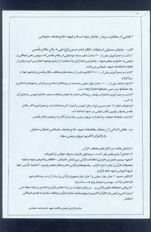 به گزارش خبرگزاری فارس از اصفهان، فتح الفتوح انقلاب اسلامی نه تثبیت مرزها و حفظ تمامیت ارزی است که رویای برخی سلسلههای بزرگ پادشاهی بوده، نه قطع دست طمع اجانب که قرنها به این آب و خاک دراز بوده و نه حتی بیرون راندن دلباختگان شرق و غرب و غارتگران این مرز و بوم، البته همه اینها از فتوحات انقلاب اسلامی بوده اما فتح الفتوح، تربیت جوانان انقلابی و انسان سازی بوده است. دفاع مقدس کارخانه انسان سازی و فرهنگ و تفکر بسیجی، قالب این کارخانه بوده است، کارخانهای که با پشتوانه اسلام ناب محمدی (ص) و توان جهاد فی سبیل الله، بی وقفه کار میکند و جوانانی به عالم عرضه میدارد که روی شیطانهای انسی و جنی را سیاه کرده و آه از نهادشان بلند میکند. تفکر بسیجی، قهرمان پرور و الگوساز است، قهرمانانی که در پی نجات تمام جهانیاناند، نجات از تاریکی نادانی و افروختن چراغ هدایت به آسمان، ابرقهرمانانی که یک تنه در برابر غول هفت سر و پولادتن استکبار و ظلم ایستاده و جان شیرین را سرمست و مجنون از دیدار حق بر دست میگیرند و اصفهان از این قهرمانان کم ندارد. باقیات و صالحات رسانهای شهید محمد سلیمانی یکی از این پهلوانان است که یاد و خاطرش در لشکر مقدس 14 امام حسین (ع) به یادگار مانده و برخی اقداماتش هنوز همراه گشا و نافع است، این شهید بزرگوار با خادمی قرآن و اقدامات بینظیر خود در عرصه تبلیغات لشکر، جاودانه شد، ثبت و ضبط مصاحبهها، وصیت نامهها، خاطرات و عکسهای رزمندگان که در شناسایی خانوادههای شهدا بسیار مؤثر بوده و هست.