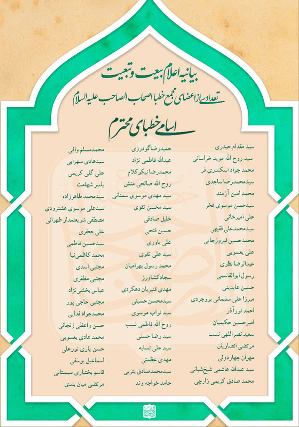 به گزارش خبرگزاری فارس از قم، تعدادی از اعضای مجمع خطبا اصحاب الصاحب علیه السلام، با صدور بیانیه‌ای حمایت و تبعیت خود از ولایت رهبر معظم انقلاب آیت الله سید مجتبی خامنه‌ای اعلام کردند.از جمله اسامی امضا کننده این بیانیه:سید حسین مومنیعبدالحسین بندانی نیشابوریحامد کاشانیجعفر واضحیمحمد صادق کفیلمحمد سعیدی آریافرهاد فتحیسعید شحیطاطحسین بنیادیعلی محمدی هوشیارحسین احمدی شاهرودیغلامعباس هاشمی همدانیمهدی هاشمی هشترودیمحسن حیدری کاشانیمحمد هادی هدایتسید جلال رضوی همدانیمحمد رضا اعوانیعلی کلاتهیاسر ماهریاحمد صابری تولاییوحید نجف زادهسید مجتبی سید سلیمانیمحمد عالم زاده نوریحبیب عباسیوحید حاجی آقازاده جعفر اسکندری امین باقرزاده محمد سعادتمند محمد مسلم وافیسید نواب موسوی محمد رضا فوادیاناحسان رنجبرو......۱۷۰ نفر از اعضای محترم مجمع