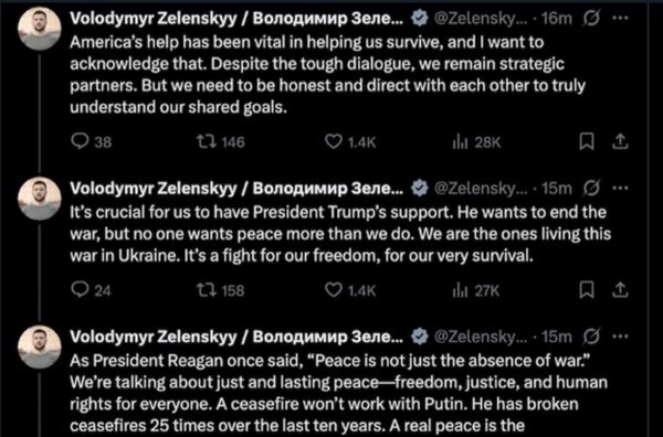 قدرتنمایی بر روی ضعف زلنسکیاما در مقابل، موضع ولودیمیر زلنسکی رئیسجمهور اوکراین است که با وجود نمایش تحقیرآمیزی که دونالد ترامپ و معاونش جی دی وَنس در مقابل رسانهها به راه انداختند و وی را از کاخ سفید اخراج کردند، همچنان برای توافق با ترامپ درخواست میکند.توافقی که در ازای توقف پیشروی روسیه، به رسمیت شناختن مناطق اشغالی توسط اوکراین و مهمتر از همه، واگذاری نیمی از ذخایر معدنی این کشور به آمریکا در ازای کمکهای پیشین واشنگتن است.زلنسکی در پستی در شبکه اجتماعی ایکس از تمام ارکان دولت و مردم آمریکا تشکر کرده و با امضای توافقنامه مواد معدنی موافقت کرده و خواستار کمک شده است.