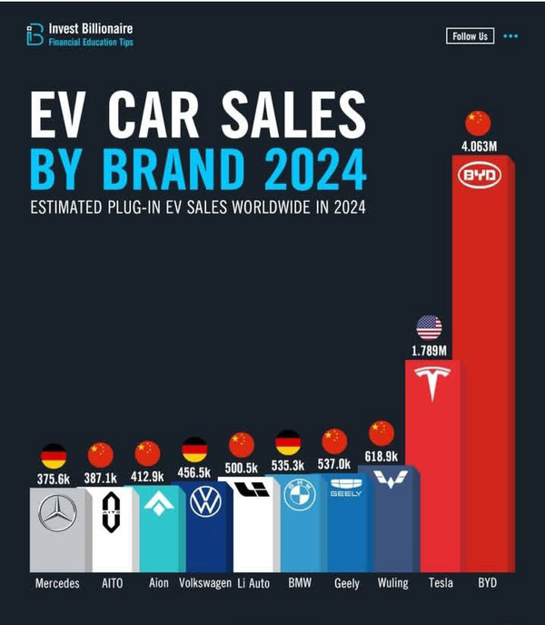 گروه اقتصادی خبرگزاری فارس؛ در دنیایی که تغییرات اقلیمی، آینده حمل‌ونقل را دگرگون کرده، حالا کشوری از شرق برخاسته و بی‌هیاهو اما با برنامه، مسیر این آینده را بازنویسی کرده است. آخرین آمار منتشرشده از سوی «Invest Billionaire» گواهی‌ست روشن بر این واقعیت؛ «چین حالا فرمان بازار خودروهای برقی جهان را به دست گرفته است.»شرکت چینی BYD با فروش ۴.۰۶۳ میلیون دستگاه، تسلای آمریکا را با ۱.۷۸۹ میلیون دستگاه و فاصله‌ای دو برابری پشت سر گذاشته و جایگاه نخست را از آن خود کرده است.