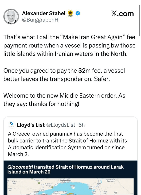 @OmidDarabi1 فروردین 1405در پاسخ بهبه طور خلاصه:پیروز این جنگ طرفی است که تنگه هرمز را کنترل کند.https://farsnews.ir/OmidDarabi/1773944583877836964آمریکا پیروزی کامل خودش در جنگ را در ۲ شرط زیر خلاصه کرده است:۱.جنگ برای چند هفته دیگر ادامه پیدا کند چون ممکن است ایران دوباره قدرت بگیرد.۲. مسیر انرژی (تنگه هرمز) دوباره باز و امن شود.چون ایران میتواند عبور نفت و گاز را مختل کند…نمایش بیشتر