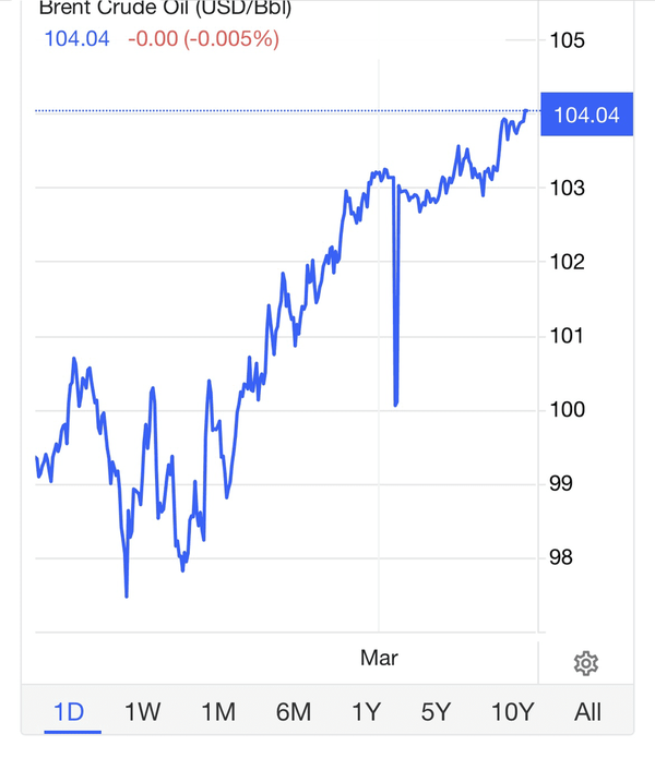 حالا قیمت نفتی که تا ۹۹ دلار در هر بشکه کاهش یافته بود، ۱۰۴.۴ دلار در هر بشکه را هم لمس کرده است. #تنگه_هرمز#جنگ_رمضان #نفت#ترامپ