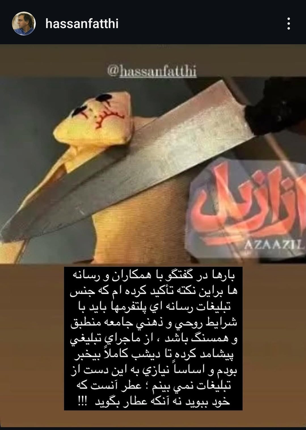 خبرگزاری فارس ـ گروه هنر و رسانه: سریال «ازازیل» به کارگردانی حسن فتحی، که در ژانر وحشت تولید شده است، بهزودی از پلتفرم نماوا پخش خواهد شد. اخیراً شیوه تبلیغاتی این سریال، شامل استوریهای ترسناک منتشرشده توسط بازیگر آن، بهرنگ علوی، جنجالهای بسیاری را برانگیخت. این استوریها به گونهای طراحی شده بودند که احساس تهدید و ناامنی را به مخاطب منتقل کنند. در نهایت، مشخص شد که این اقدامات بخشی از کمپین تبلیغاتی سریال بوده است.با این حال، این روش نهتنها با واکنش منفی گسترده مخاطبان مواجه شد، بلکه حسن فتحی نیز در بیانیهای اعلام کرد که این اقدامات بدون هماهنگی با وی انجام شده و نسبت به آن انتقاد دارد.