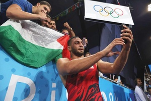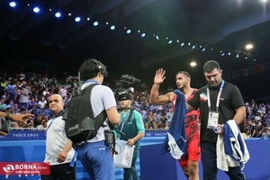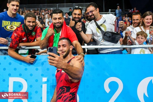 Iranian freestyle wrestler Amir Ali Azarpira, who clinched a bronze medal in the 97 kg category by defeating Olympic and World Champion Kyle Snyder from the United States, posed for a selfie with spectators holding the Palestinian flag in a show of solidarity following his victory. [PHOTOS]