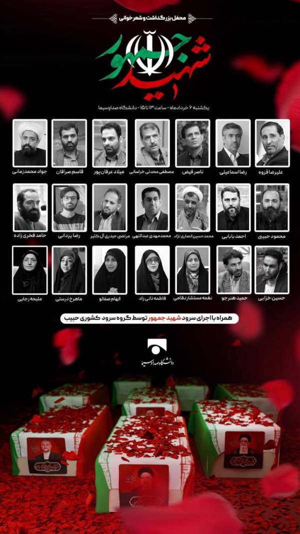 این مراسم فردا، یکشنبه ۶ خردادماه، از ساعت ۱ ظهر در دانشگاه صدا و سیما واقع در در محله آرارات تهران، خیابان نمایشگاه،خیابان حافظ،خیابان ششم آغاز شده و تا ۳ عصر ادامه خواهد داشت. #شهید_جمهور