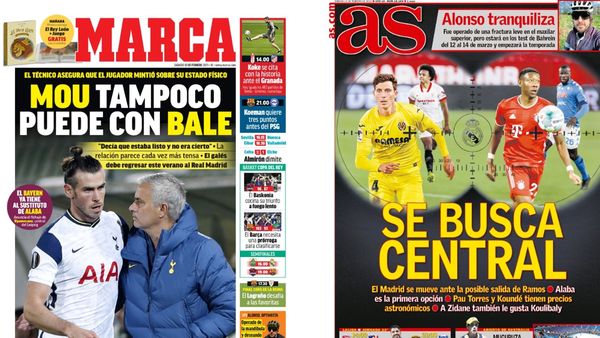 به گزارش خبرگزاری فارس، مطبوعات اسپانیا در روز شنبه 25 بهمن – 13 فوریه در خصوص مهمترین مسائل فوتبال در این کشور صحبت کردند. بررسی روزنامه‌های ورزشی اسپانیا را در اینجا بخوانید. مارکا چاپ مادرید در خصوص رابطه سرد مورینیو و گرت بیل نوشت و با تیتر «ژوزه نمی‌تواند با بیل کاری بکند» از بازگشت ستاره ولزی به مادرید در تابستان خبر داد. ژوزه مورینیو در کنفرانس خبری خود درباره عدم جاه طلبی گرت بیل گفت و از نحوه تمرین کردن این بازیکن انتقاد کرد. این بازیکن که در مادرید به یک نیمکت نشین بدل شده بود، در اسپرز نیز نتوانست به ترکیب اصلی راه پیدا کند و هیچ فرقی با گذشته نکرد.سران مادرید امیدوار بودند که بیل با بازگشت به تیم سابق خود و کار کردن با مورینیو بتواند به رشدی دست یابد، اما این اتفاق رخ نداد و این بازیکن قرار است تابستان بازگردد تا سال آخر قرارداد خود را در مادرید سپری کند. آ.اس چاپ مادرید تیتر «اهداف مرکزی» را به روی جلد برد و از علاقه مادرید برای خرید 2 مدافع مرکزی پرده برداشت. سرخیو راموس به احتمال فراوان تیم را در پایان فصل ترک می‌کند و برخی زمزمه‌ها نیز از رفتن واران به منچستریونایتد خبر می‌دهند. به همین دلیل رئال سعی دارد هر طور شده در تابستان 2021، از بین 4 بازیکن زیر مدافعی را خریداری کند.  «دیوید آلابا»، «پائو تورس»، «ژولس کنده» و «موسی کولی‌بالی»‌ در بین اهداف مادرید قرار گرفته‌اند. موندو دپورتیوو چاپ بارسلونا با تیتر «امتحان برای پاریس» به استقبال بازی امشب بارسا و آلاوس رفت.