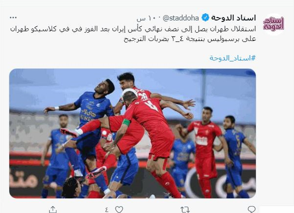 به گزارش خبرگزاری فارس، تیم های فوتبال استقلال وپرسپولیس شب گذشته در دربی تهران در مرحله یک چهارم نهایی جام حذفی به مصاف هم رفتند که این بازی در 90 دقیقه و وقت های اضافه با نتیجه تساوی بدون گل به پایان رسید. در نهایت استقلال در ضربات پنالتی با نتیجه 4 بر 3 به پیروزی رسید و راهی نیمه نهایی جام حذفی شد. در همین رابطه نشریه معتبر «استاد الدوحه» قطر در بازتاب این بازی مهم در آسیا، نوشت: استقلال بعد از پیروزی در بازی ال کلاسیکو تهران مقابل پرسپولیس در ضربات پنالتی با نتیجه 4 بر 3 به نیمه نهایی جام حذفی ایران رسید. انتهای پیام/