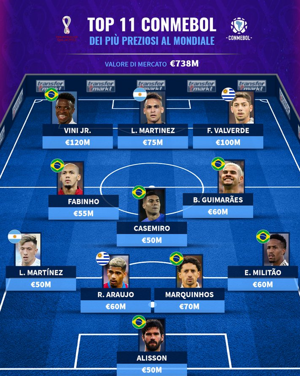 **ترکیب منتخب 11 نفره جام جهانی از قاره آمریکای جنوبی را در زیر مشاهده کنید: دروازهبان: آلیسون بکر (برزیل - لیورپول) - 50 میلیون یورو مدافع وسط: رونالد آرائخو (اروگوئه - بارسلونا) - 60 میلیون یورو مدافع وسط: مارکینیوش (برزیل - پاری سن ژرمن) - 70 میلیون یورو مدافع راست: ادر میلیاتو (برزیل - رئال مادرید) - 60 میلیون یورو مدافع چپ: لائوتارو مارتینز (آرژانتین - منچستریونایتد) - 50 میلیون یورو هافبک تدافعی: کاسمیرو (برزیل - منچستریونایتد) -50 میلیون یورو هافبک وسط: فابینیو (برزیل - لیورپول) - 55 میلیون یورو هافبک وسط: برونو گویمارائش (برزیل - نیوکاسل) - 55 میلیون یورو وینگر چپ: وینیسیوس ( برزیل - رئال مادرید) - 120 میلیون یورو وینگر راست: فده والورده (اروگوئه - رئال مادرید) - 100 میلیون یورو مهاجم نوک: لائوتارو مارتینز (آرژانتین - اینترمیلان) - 75 میلیون یورو پایان پیام/