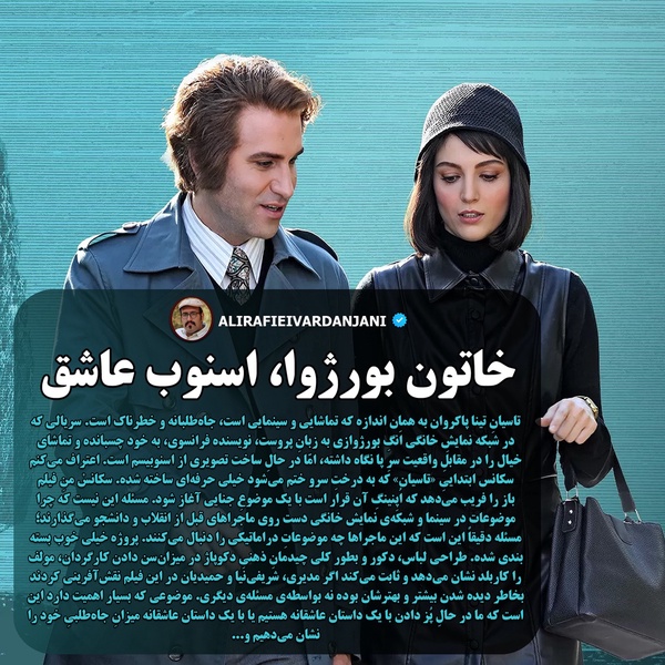 به بهانهی پخش قسمت اول «تاسیان» اختصاصی در فارس تعاملی بخوانید.تاسیانِ تینا پاکروان به همان اندازه که تماشایی و سینمایی است، جاهطلبانه و خطرناک است. سریالی که در شبکه نمایشِ خانگی اَنگِ بورژوازی به زبانِ پروست، نویسنده فرانسوی، به خود چسبانده و تماشای خیال را در مقابلِ واقعیت سرِ پا نگاه داشته، امّا در حالِ ساخت تصویری از اسنوبیسم است. اعتراف میکنم سکانس ابتداییِ «تاسیان» که به درختِ سرو ختم میشود خیلی حرفهای ساخته شده. سکانسْ منِ فیلمباز را فریب میدهد که اُپِنینگِ آن قرار است با یک موضوعِ جنایی آغاز شود. مسئله این نیست که چرا موضوعات در سینما و شبکهی نمایش خانگی دست روی ماجراهای قبل از انقلاب و دانشجو میگذارند؛ مسئله دقیقاً این است که این ماجراها چه موضوعاتِ دراماتیکی را دنبال میکنند. پروژه خیلی خوب بسته بندی شده. طراحی لباس، دکور و بطور کلی چیدمانِ ذهنیِ دکوپاژ در میزانسن دادن کارگردان، مولف را کاربلد نشان میدهد و ثابت میکند اگر مدیری، شریفینیا و حمیدیان در این فیلم نقشآفرینی کردند بخاطر دیده شدن بیشتر و بهترشان بوده نه بواسطهی مسئلهی دیگری. موضوعی که بسیار اهمیت دارد این است که ما در حالِ پُز دادن با یک داستان عاشقانه هستیم یا با یک داستان عاشقانه میزانِ جاهطلبیِ خود را نشان میدهیم. این موضوع ختم میشود به ارجاعاتی که مولف در سکانسها و میاننوشتهی ابتدای فیلم. تقدیم به استادم بهرام بیضایی، پوستری از «گاو» مهرجویی، «اسرار گنج درهی جنّی» گلستان و...✍️#علی_رفیعی_وردنجانی#تاسیان#نقد_فیلم#شبکه_نمایش_خانگی#فارس_تعاملی#مهران_مدیری#بابک_حمیدیان#نازنین_بیاتی#تینا_پاکروان#سینما_و_تئاتر#خاتون#بورژوا#اسنوب#انقلاب_اسلامی🎩@alirafieivardanjani