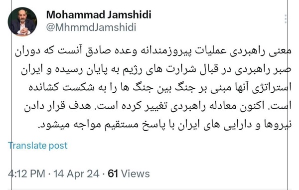 @user17097457449327 فروردین 1403در پاسخ بهسلام.امروز رژیم صهیونیستی چه از بُعد سیاسی و چه نظامی در مقابل جبهه مقاومت و ایران اسلامی از موضع ضعف و درماندگی نمایان است و به فرموده امام خامنه ای (رهبر معظم انقلاب اسلامی) :(دیگر دوران بزن دررو ، برای کفار گذشته است - اگر بزنید می خورید).امروز استراتژی اسرائیل (معادله مثبته) نابود شد.تشکر.