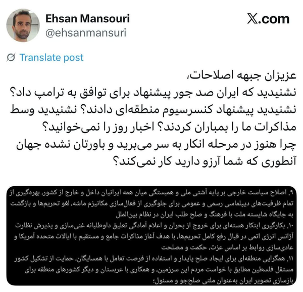@user17527238395827 مرداد 1404در پاسخ بهفرض بگیریم ایندجبهه اصلاحات همه خائن هستند و به خاطر این بیانیه در ملا عام اعدامشان کنید. بفرمایید پیشنهاد شما برای برون رفت از شرایط فعلی چیه؟ اگر قبول ندارید اصلا که شرایط فعلی مطلوب نیست و مردم هم اصلا مشکل ندارند که کلا بحث دیگه ای است. چون قطعا ادامه شرایط فعلی یا حرکت به سمت یک جنگ دیگر که...