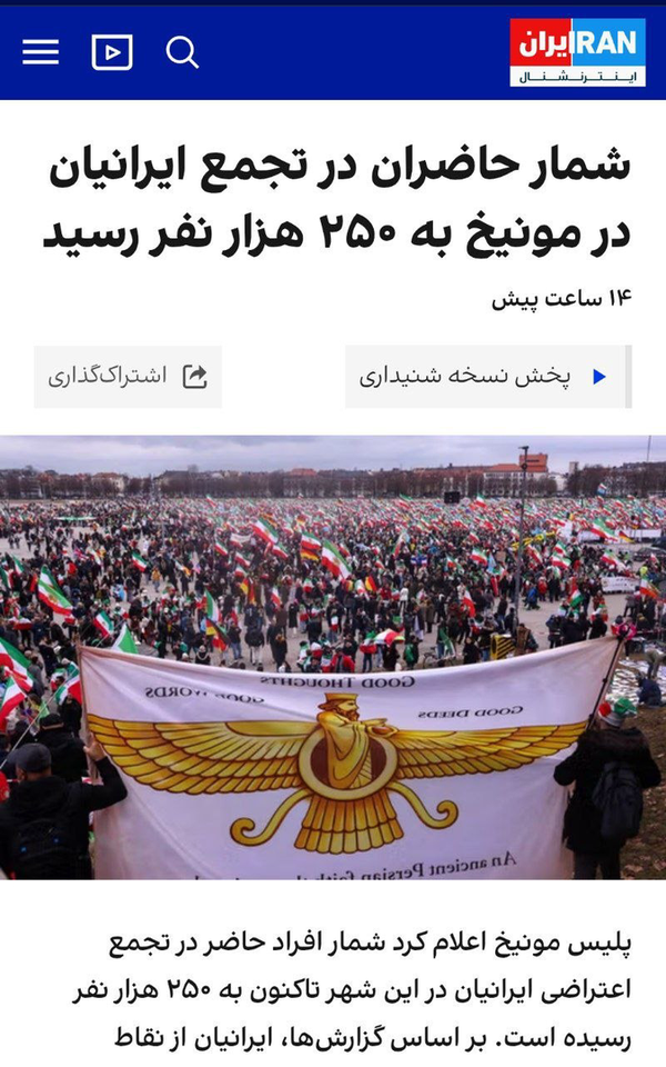 گروه فارس پلاس: ایران اینترنشنال در گزارشی درباره حضور سلطنت‌طلبان با عددسازی خاصی نوشت: «پلیس مونیخ اعلام کرد شمار افراد حاضر در تجمع اعتراضی ایرانیان در این شهر تاکنون به ۲۵۰ هزار نفر رسیده است. بر اساس گزارش‌ها، ایرانیان از نقاط مختلف اروپا برای اعلام همبستگی با مردم ایران و در پی فراخوان شاهزاده رضا پهلوی به مونیخ رفته‌اند و در این تجمع شرکت کرده‌اند.»