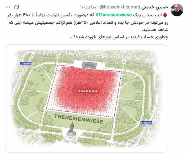 همچنین با ارائه تصاویر میدان Theresienwiese مونیخ به هوش مصنوعی درباره میزان گنجایش و همچنین میزان جمعیتی که در تجمع سلطنت‌طلبان در این میدان دیده می‌شود، سئوالی پرسیدیم که در این راستا هوش مصنوعی عنوان کرد که میزان گنجایش این مکان با فشار جمعیتی بالا 250 هزار نفر است و در تصویر به طور تخمینی 13 هزار نفر و در رقم بالاتر حداکثر 30 هزار نفر دیده می‌شود.