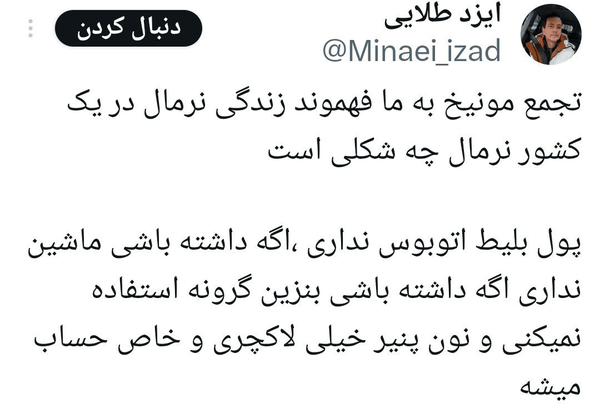 @user1768914035701 اسفند 1404در پاسخ بهمونیخ، تورنتو، لس آنجلس و ده ها شهر دیگه در سراسر دنیا...چند صد هزار نفر ایرانی تجمع کردند. شما اونوقت اومدی تبلیغ میکنی که حتی با اتوبوس ساعتها راه اومدن با نون و پنیر که علیه نظام تجمع اعتراضی بکنن. پس پول اینام نگرفتن دیگه. جالبه همچین تبلیغی براشون توی فارس!