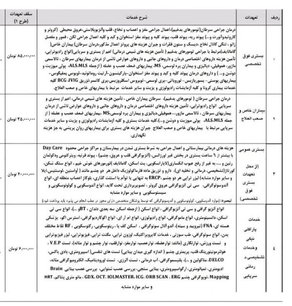 سقف تعهد در قراداد جدید بیکه تکمیلی در بخش بستری فوق تخصصی 85 میلیون تومان درنظر گرفته شده است.براساس توافقی که صورت گرفته است و براساس جدول اعلام شده برای بیماران خاص و صعب العلاج 35 میلیون تومان، سقف بستری عمومی 40 میلیون تومان، خدمات پاراکلینیکی و خدمات تشخیصی، درمانی و سرپایی 6 میلیون تومان، خدمات تشخیصی درمانی- سرپایی 4 میلیون تومان، خدمات آزمایشگاهی و پاتولوژی 2 میلیون و 250 هزار تومان، رفع عیوب انکساری چشم 6 میلیون تومان برای یک چشم و 12 میلیون تومان برای دو چشم و آمبولانس داخل شهری 2 میلیون تومان و آمبولانس بین شهری 3 میلیون تومان است.