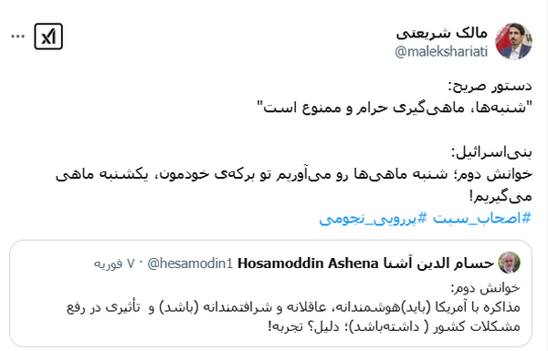 مالک شریعتی نماینده مردم تهران در مجلس نیز در توییتی کنایه آمیز در پاسخ به آشنا و دیگر تحریف کنندگان می نویسد که «دستور صریح:"شنبهها، ماهیگیری حرام و ممنوع است" بنیاسرائیل: خوانش دوم؛ شنبه ماهیها رو میآوریم تو برکهی خودمون، یکشنبه ماهی میگیریم!»