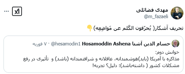 با این وجود پس از توییت حسام الدین آشنا بخش دیگری از اصلاح طلبان خوانش اشتباه و تحریف گونه خود از بیانات صریح رهبری را در پیش گرفتند، به طور مثال محمدرضا مهاجر از فعالین اصلاح طلب در توییتی می نویسد که «روی دیگر فرمایش رهبر انقلاب، احیای برجام است. ایران و امریکا به تعبیر ایشان نشستند، خندیدند، رفاقت کردند و به یک توافقی رسیدند و امریکا از این توافق خارج شد.حالا اگر امریکا تعهدات برجامی خود را انجام دهد و به برجام بازگردد ماجرا فرق میکند.»