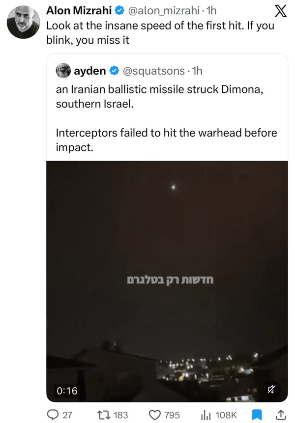 @Mohamed_kh2 فروردین 1405در صورت حمله اتمی به ایران به تلآویو و حیفا حمله اتمی میکنیمنیروگاه دیمونا رو هم منهدم و مراکز کشوهای حاشیه خلیج فارس رو بمبارن اتمی میکنیم