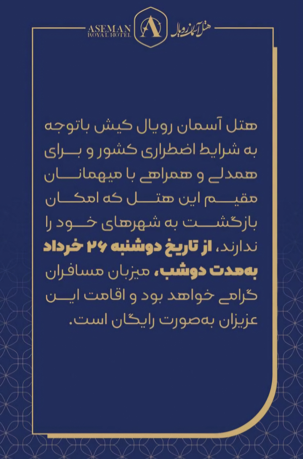 در جزیره زیبای کیش، «هتل آسمان» با اهدای دو روز اقامت رایگان به مسافران واجد شرایط، باری از دوش آنها برداشته و جلوهای از مهماننوازی اصیل ایرانی را به نمایش گذاشت.