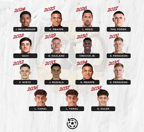 بر اساس پیش بینی هوش مصنوعی، لیونل مسی موفق می شود در سال 2026 همزمان با برگزاری جام جهانی به میزبانی آمریکا، مکزیک و کانادا «توپ طلای نهم» خود را دریافت می‌کند.پیش بینی هوش مصنوعی درباره برندگان توپ طلا تا سال 2038 به شرح زیر است:2024: جود بلینگام2025: کیلیان امباپه2026: لیونل مسی2027: فیل فودن2028: گاوی2029: هالند2030: وینیسیوس2031: ایوان فرگوسن2032: فلورن ویرتس2033: جمال موسیالا2034: کیلیان امباپه2035: ایوان فرگوسن2036: لامین یامال2037: لامین یامال2038: آردا گولر#توپ_طلا#مسی#بلینگام#هوش_مصنوعی