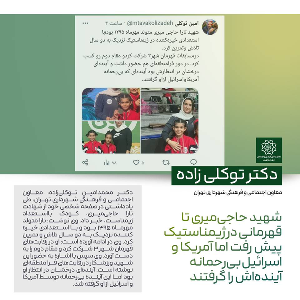 دکتر محمدامین توکلیزاده، معاون اجتماعی و فرهنگی شهرداری تهران، طی یادداشتی در صفحه شخصی خود از شهادت تارا حاجیمیری، کودک بااستعداد ژیمناست، خبر داد. وی نوشت: تارا متولد مهرماه ۱۳۹۵ بود و با استعدادی خیره کننده نزدیک به دو سال تلاش و تمرین کرد. معاون امور اجتماعی و فرهنگی شهرداری تهران در ادامه آورده است: او در رقابتهای قهرمان شهر ۳ شرکت کرد و مقام دوم را به دست آورد. وی سپس با اشاره به حضور این شهید ورزشکار در رقابتهای فرا منطقهای نوشته است: آیندهای درخشان در انتظار او بود اما این آینده بیرحمانه توسط آمریکا و اسرائیل از او گرفته شد.