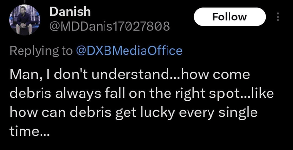 کاربر دیگری میگوید: «برام قابلدرک نیست چطور بقایای رهگیری هر بار دقیقاً توی محلهای حساس فرود میان؛ این قطعات چطور میتونن هر بار تا این حد «خوششانس» باشن.».