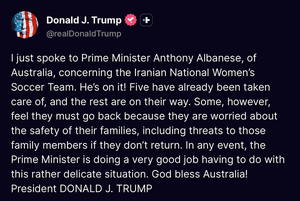 منتخب كرة القدم الايراني للسيدات اصبح رهينة في استراليا وفق خطة ترامب وحرب دعائية اعلامية من جانب اميركا واستراليا.