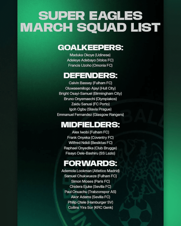 فهرست ۲۳ نفره تیم ملی فوتبال نیجریه برای دیدارهای دوستانه ماه مارس اعلام شد.
