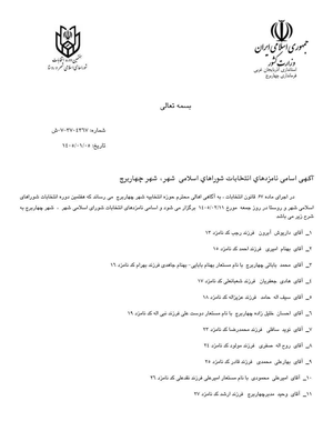نامزدهای نهایی انتخابات شورای شهر چهاربرج اعلام شد