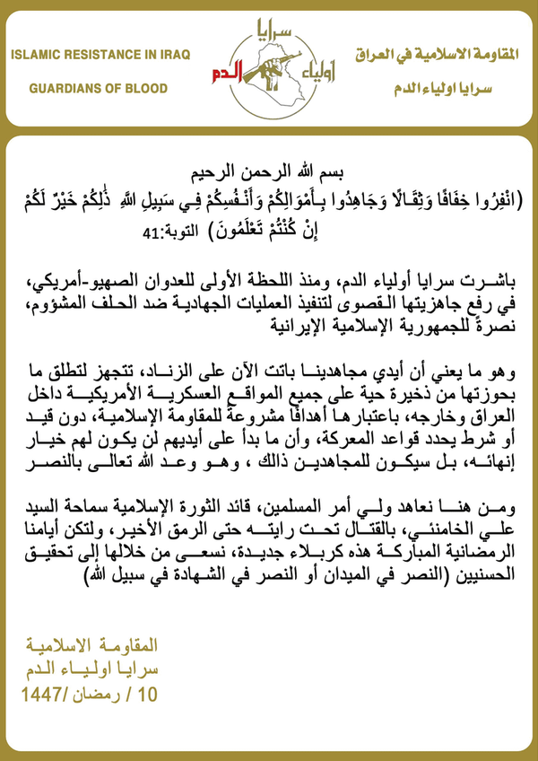 گروه مقاومت اسلامی «سرایا أولیاء الدم» در عراق بر ایستادگی در کنار ایران و آماده شدن برای انجام حملات علیه تمامی مراکز نظامی آمریکایی در عراق و خارج از آن تاکید کرد.