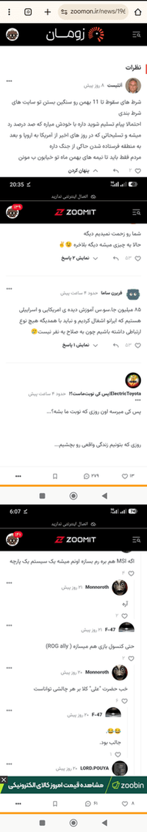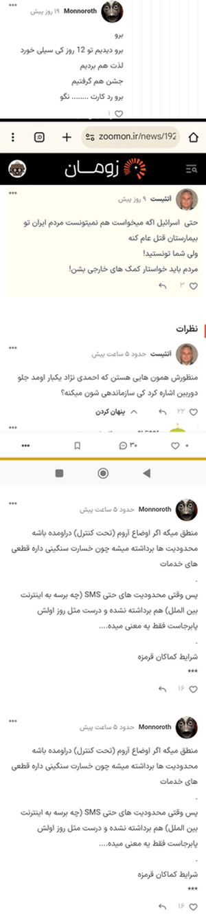 به نام جمهوری اسلامی ایران متأسفانه علیرغم تمام هشدارهای امنیتی، کامنتهای زومیت، زومان و باقی زیرمجموعهها باز شد و مجدداً شاهد نظرات اغتشاشگران فضای مجازی در این سایتهای داخلی هستیم که در باتلاق تروریسم صهیونیستی و مجاهدین خلقی دستوپا میزنند و افسار افق کنشهایش را به جنایتکاران جنگی تحت تعقیب (نتانیاهو) و امپریالیسم هار آمریکا سپردهاند و کاملاً شفاف و بدون هیچ روتوشی تقاضای حمله نظامی به مام وطن و اجتماع و اغتشاش علیه نظام جمهوری اسلامی ایران را دارند. به مقدسات کنایه میزنند و تروریسم پهلوی را به جمهوری اسلامی ایران نسبت میدهند. نکته فجیعتر اینکه نظرات ضد انقلاب در این سایتها انتشار و نمایش داده میشود و نظرات انقلابیها بایکوت و حذف میگردد. اینگونه رفتارها حقیقتاً از ساحت هرگونه تسامح و تساهلی خارج است. عاجزانه از مسئولین فداکار امنیتی تقاضای پیگیری دارم و از مسئولین محترم و خدوم قضایی هم خواهشمندم حکم دسترسی به دیتابیس این سایتها را صادر کنند، نه تنها عوامل، بلکه کامنتگذاران خاطی این سایتها را محاکمه کنند. چرا که اغتشاش مجازی پیشزمینهٔ اغتشاشات میدانیست.