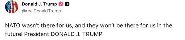 گروه بین‌الملل خبرگزاری فارس، رئیس جمهور آمریکا دونالد ترامپ لحظاتی پیش در پیامی در شبکه اجتماعی سوشال تروث خشم خود از عدم همراهی ناتو با آمریکا در قبال ایران نوشت «ناتو نه در گذشته به داد ما رسید، نه در آینده به داد ما خواهد رسید!»