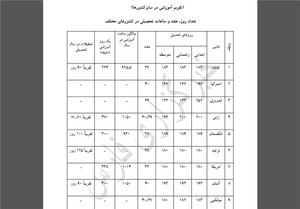 *مجموع تعطیلات یکسال تحصیلی مجموع تعطیلات مختلف در این کشور از جمله تعطیلات تابستانی تقریبا 100 روز است ترکیه *شروع سن آموزشی سن آموزشی در کشور ترکیه از 6 سالگی آغاز می‌شود و در 17 سالگی به پایان می‌رسد. *شروع سال تحصیلی دانش‌آموزان ترکیه‌ای از اواسط ماه سپتامبر مدرسه را آغاز می‌کنند و تا آخر ژانویه نیز به مدرسه می‌روند که آغاز مدارس آنها برابر با حدود 25 شهریور ماه در ایران است.*ساعت شروع کلاس‌های مدرسه کلاس‌های آموزشی در ترکیه رأس ساعت 8:30 صبح آغاز می‌شود و رأس ساعت 13:30 به پایان می‌رسد. *تعداد روزهای تحصیلی هر سه مقطع ابتدایی، راهنمایی و دبیرستان در کشور ترکیه 180 روز آموزشی را پشت سر می‌گذرانند. *تعداد هفته‌های آموزشی دانش‌آموزان ترکیه‌ای تقریبا 38 هفته آموزشی را طی یکسال تحصیلی بر سر کلاس درس هستند. *میانگین ساعت آموزشی در سال دانش‌آموزان هر سه مقطع تحصیلی در کشور ترکیه حدود 800 ساعت آموزشی را طی یکسال تحصیلی پشت سر می‌گذرانند.*مجموع تعطیلات یکسال مجموع تعطیلات مختلف در این کشور از جمله تعطیلات تابستانی تقریبا برابر با 125 روز است. آمریکا *شروع سن آموزشی آموزش و پرورش در کشور آمریکا قبل 6 سالگی آغاز می‌شود و با پایان 17 سالگی به اتمام می‌رسد.*شروع سال تحصیلی ابتدای ماه سپتامبر سال تحصیلی آمریکا آغاز می‌شود و 26 ژوئن به پایان می‌رسد که این تاریخ برابر با 10 شهریور ماه تا 5 تیرماه در ایران است.